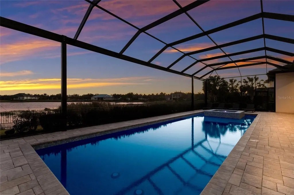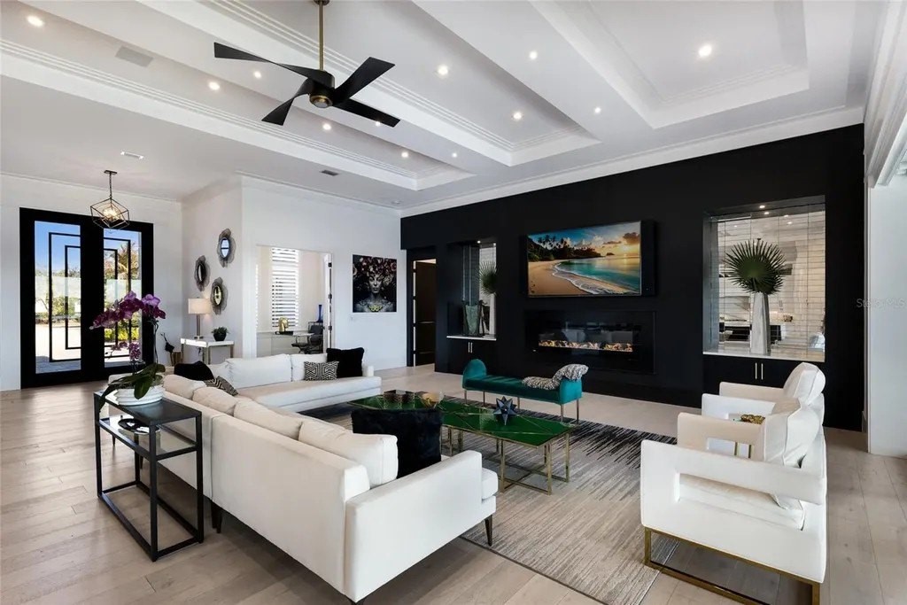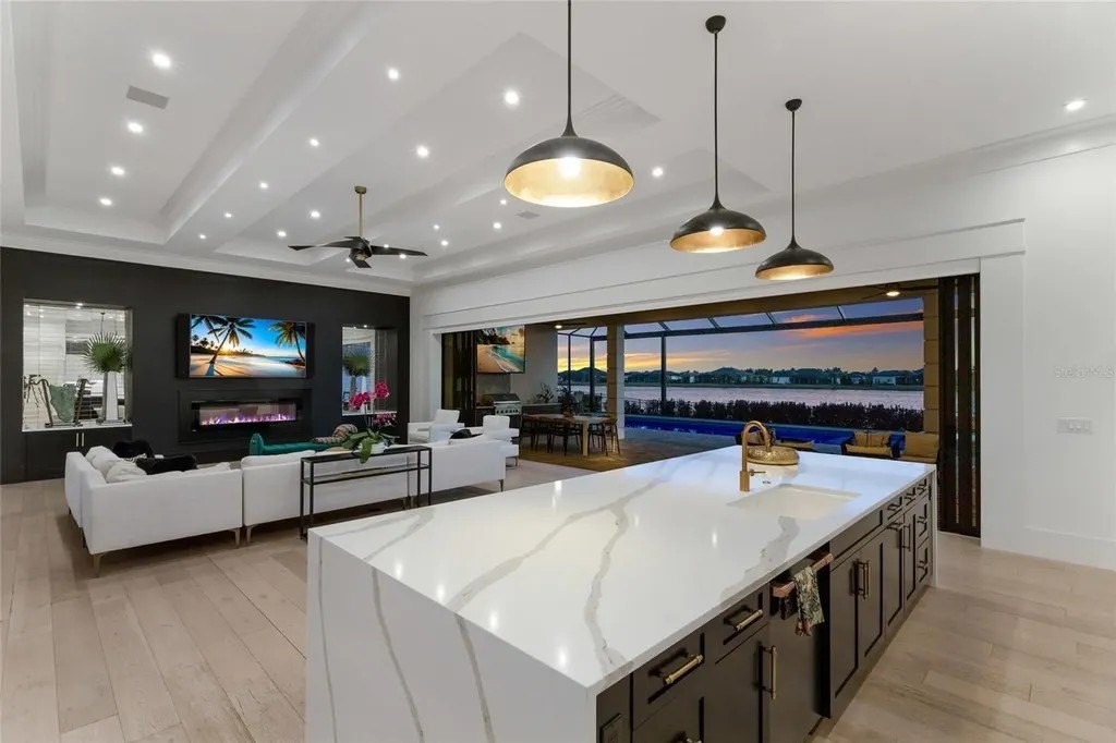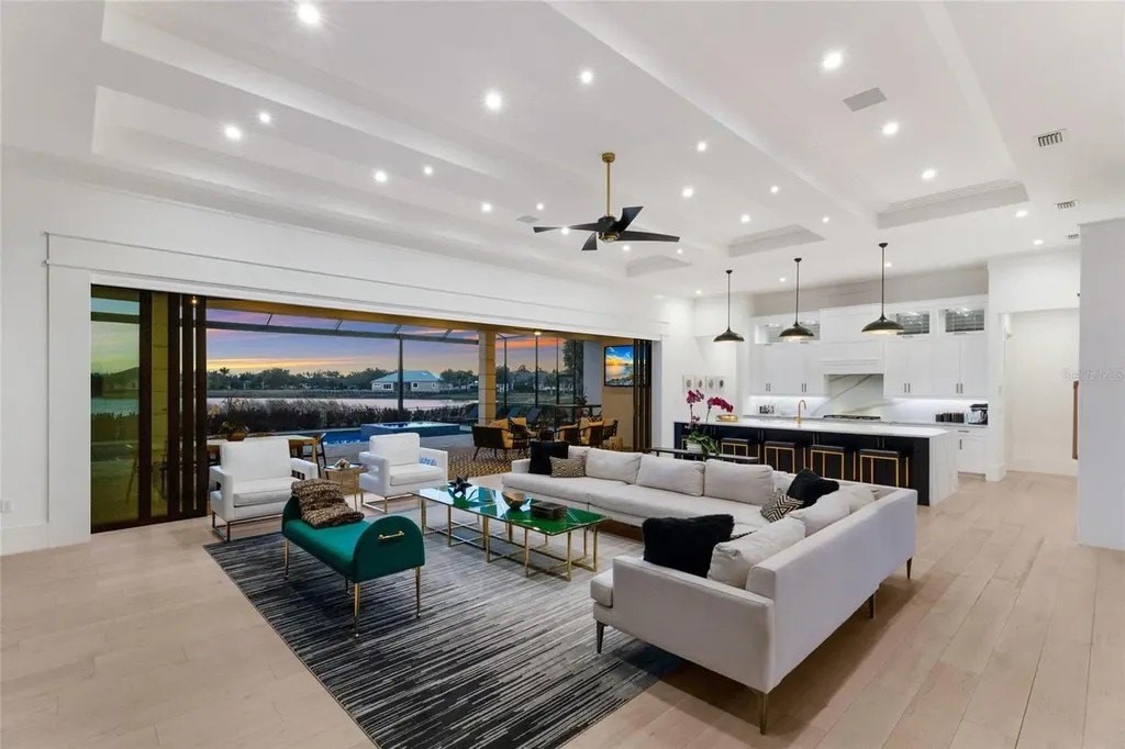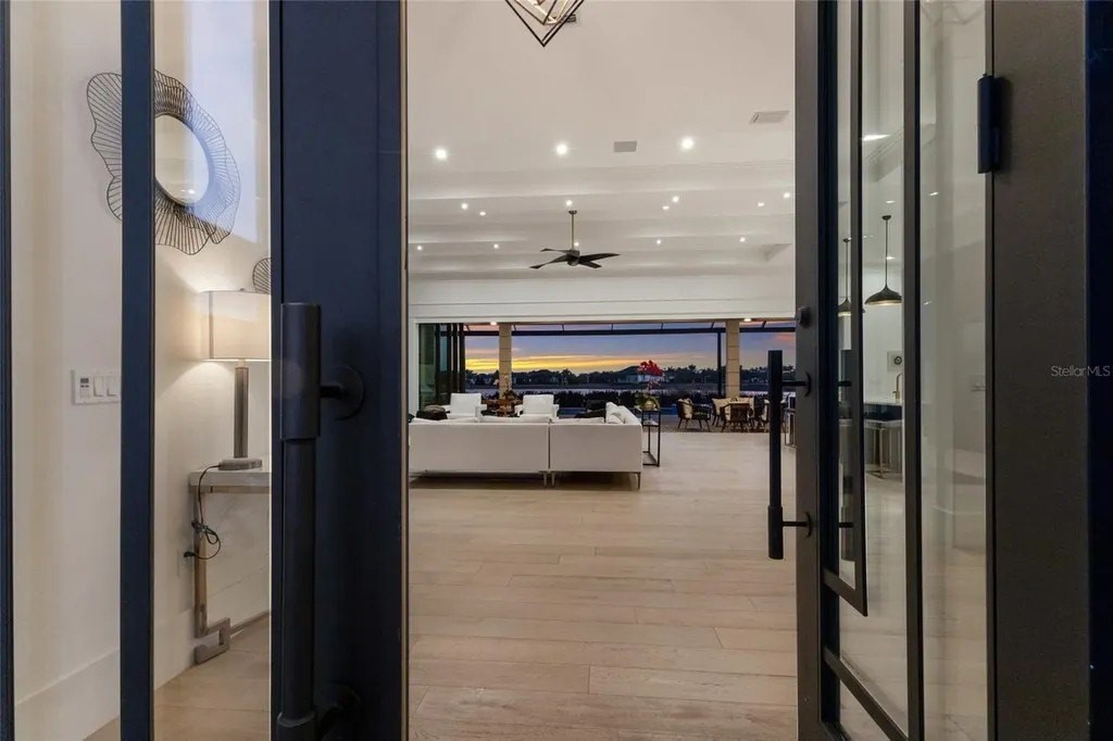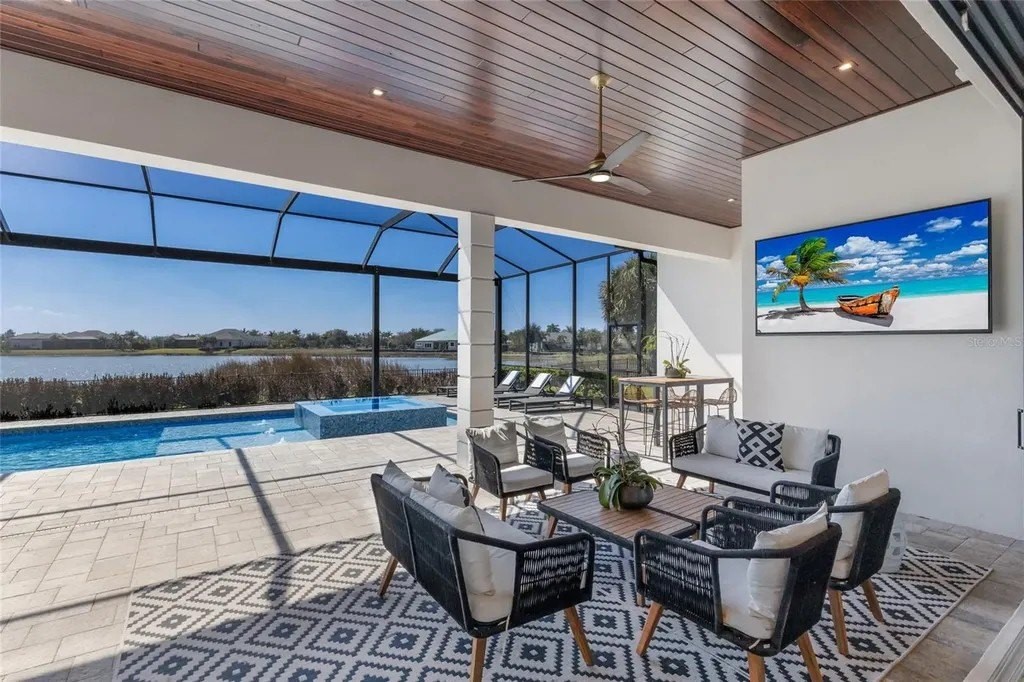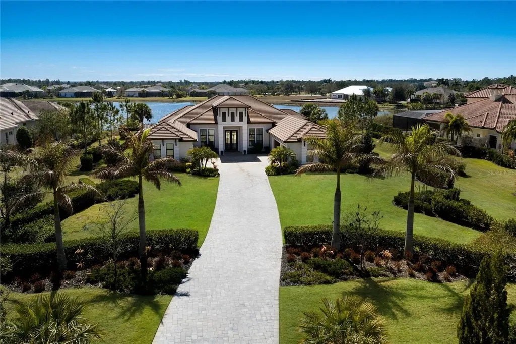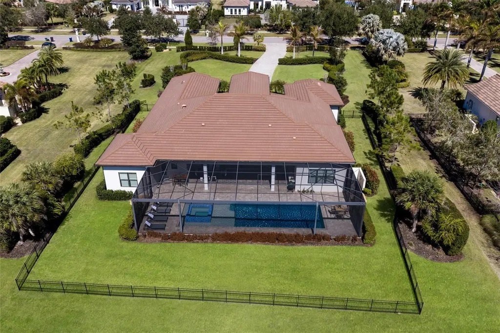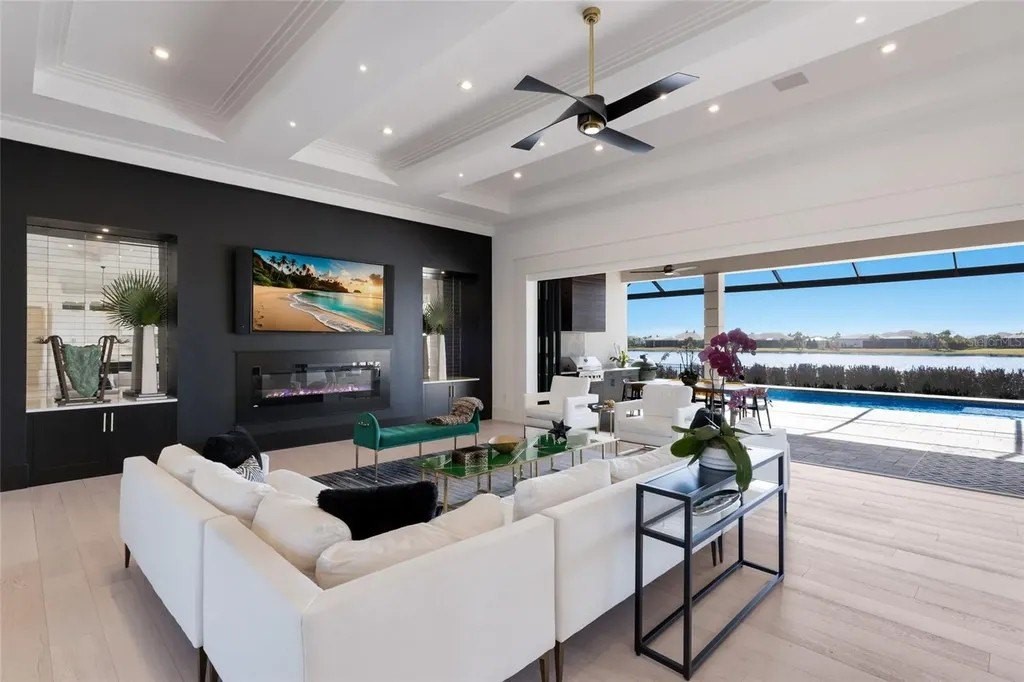 A stately arrival sets the tone for this exceptional custom residence, thoughtfully positioned on over one acre within the gates of The Concession. Blending modern luxury with architectural refinement, the home offers a rare combination of privacy, elegance, and timeless design in one of Lakewood Ranch’s most exclusive communities. Custom double entry doors welcome you into a light-filled interior where engineered hardwood floors anchor the main living spaces and a dramatic wall of sliding glass doors frame serene water views, seamlessly connecting indoor and outdoor living. At the heart of the residence, the chef’s kitchen is both polished and highly functional, appointed with Monogram and Caf appliances and anchored by a generous statement quartz island that serves as both focal point and gathering space. Designed to flow effortlessly into the great room and outdoor living areas, the layout supports both elevated entertaining and comfortable everyday living. Architectural elements define the great room, where a custom-designed accent wall showcases intricate detailing, a sleek linear fireplace, and an oversized mounted television, creating a striking focal point that balances warmth with modern design. Tray ceilings throughout further enhance the home’s architectural character, while curated designer lighting, plantation shutters, and a newly installed outdoor surround sound system underscore the thoughtfully executed craftsmanship. The primary suite offers a private retreat of generous proportions, complete with a sitting area and dual custom walk-in closets. The spa-inspired bath features expansive dual vanities, a soaking tub, and a dramatic walk-through shower with triple shower heads, including an overhead rain feature delivering a resort-caliber experience. Two additional guest suites each offer beautifully appointed en-suite baths with elevated design selections tailored for today’s discerning buyer. A private office with oversized windows invites abundant natural light, while the formal dining room is enhanced by a dramatic wine display that serves as a striking focal point for elegant entertaining. A spacious bonus room provides flexible space for recreation, media, or additional guest accommodations. Outdoors, the experience continues with a large pool and spa, expansive covered lanai, and a nicely appointed outdoor kitchen, creating a true resort-style setting. The five-car garage provides exceptional capacity for the automotive enthusiast and additional storage needs, while a fenced yard allows for secure outdoor enjoyment. Constructed with hurricane impact doors and windows throughout and supported by a whole-house generator, the home offers peace of mind with uncompromising quality. This residence masterfully blends functionality with a refined, designer-forward aesthetic, delivering privacy, security, and elevated living. Located just minutes from UTC, Waterside dining and shopping, and the Gulf Coast’s renowned beaches, it offers proximity to everything while maintaining an atmosphere of serene exclusivity. A distinguished offering for those seeking elevated luxury and the true Concession lifestyle.