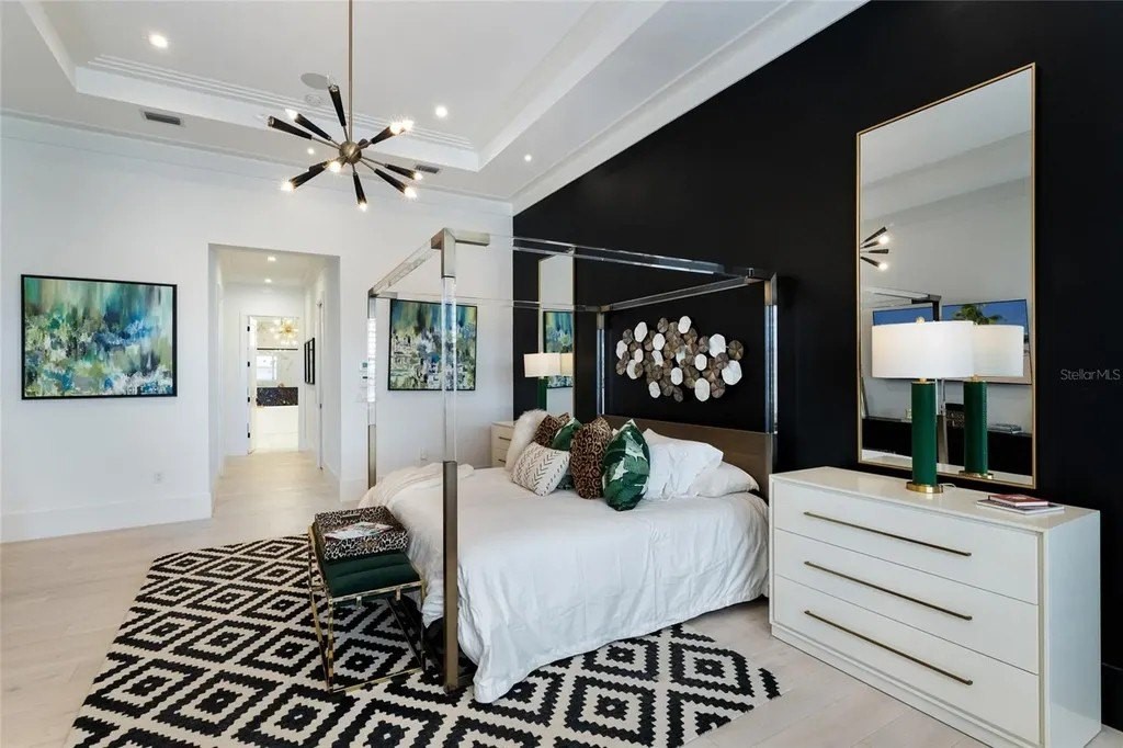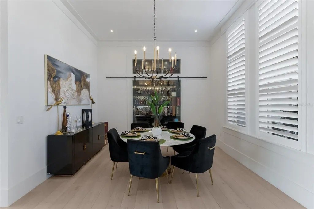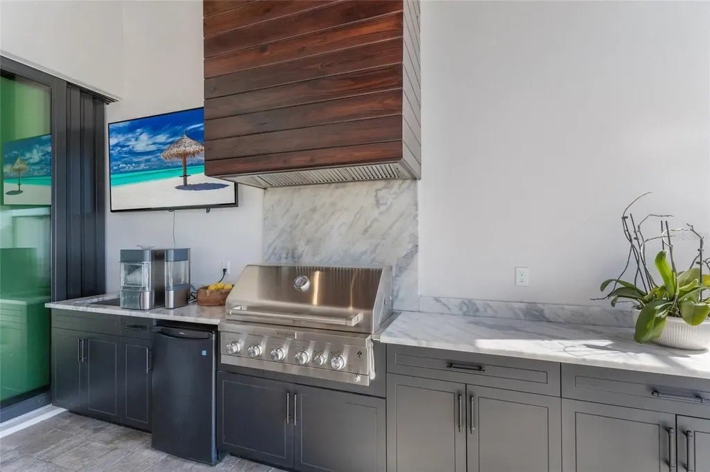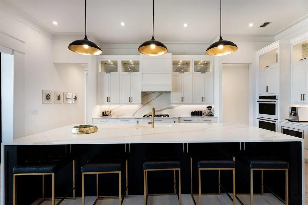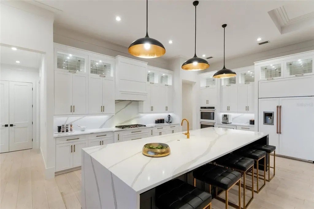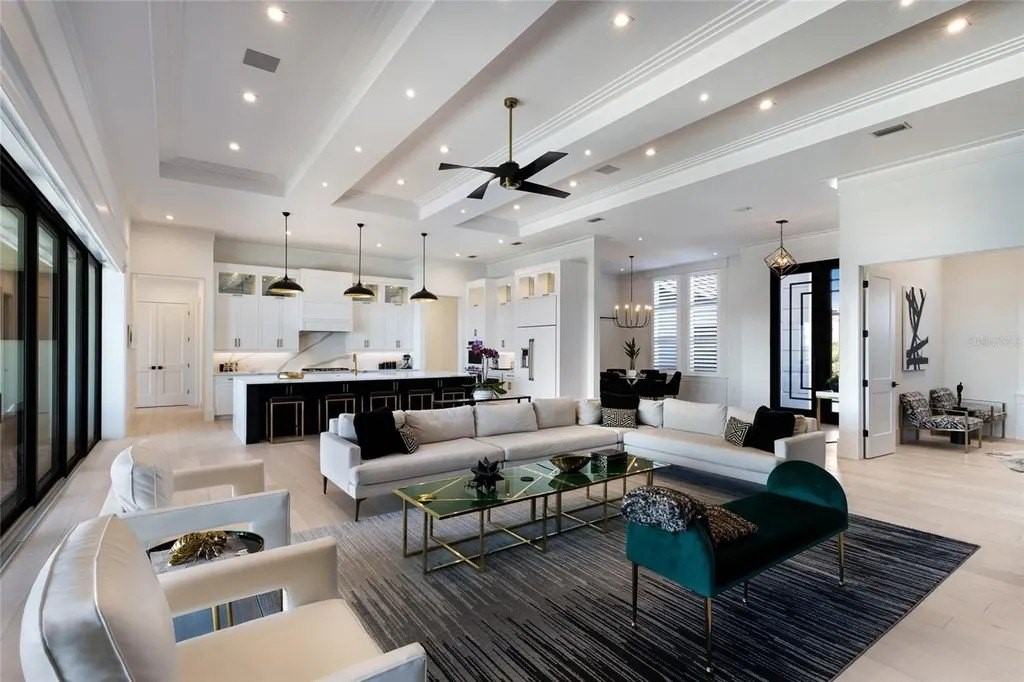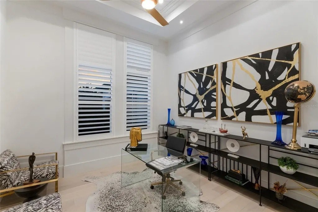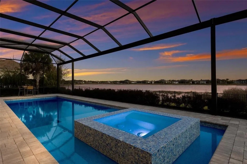 A stately arrival sets the tone for this exceptional custom residence, thoughtfully positioned on over one acre within the gates of The Concession. Blending modern luxury with architectural refinement, the home offers a rare combination of privacy, elegance, and timeless design in one of Lakewood Ranch’s most exclusive communities. Custom double entry doors welcome you into a light-filled interior where engineered hardwood floors anchor the main living spaces and a dramatic wall of sliding glass doors frame serene water views, seamlessly connecting indoor and outdoor living. At the heart of the residence, the chef’s kitchen is both polished and highly functional, appointed with Monogram and Caf appliances and anchored by a generous statement quartz island that serves as both focal point and gathering space. Designed to flow effortlessly into the great room and outdoor living areas, the layout supports both elevated entertaining and comfortable everyday living. Architectural elements define the great room, where a custom-designed accent wall showcases intricate detailing, a sleek linear fireplace, and an oversized mounted television, creating a striking focal point that balances warmth with modern design. Tray ceilings throughout further enhance the home’s architectural character, while curated designer lighting, plantation shutters, and a newly installed outdoor surround sound system underscore the thoughtfully executed craftsmanship. The primary suite offers a private retreat of generous proportions, complete with a sitting area and dual custom walk-in closets. The spa-inspired bath features expansive dual vanities, a soaking tub, and a dramatic walk-through shower with triple shower heads, including an overhead rain feature delivering a resort-caliber experience. Two additional guest suites each offer beautifully appointed en-suite baths with elevated design selections tailored for today’s discerning buyer. A private office with oversized windows invites abundant natural light, while the formal dining room is enhanced by a dramatic wine display that serves as a striking focal point for elegant entertaining. A spacious bonus room provides flexible space for recreation, media, or additional guest accommodations. Outdoors, the experience continues with a large pool and spa, expansive covered lanai, and a nicely appointed outdoor kitchen, creating a true resort-style setting. The five-car garage provides exceptional capacity for the automotive enthusiast and additional storage needs, while a fenced yard allows for secure outdoor enjoyment. Constructed with hurricane impact doors and windows throughout and supported by a whole-house generator, the home offers peace of mind with uncompromising quality. This residence masterfully blends functionality with a refined, designer-forward aesthetic, delivering privacy, security, and elevated living. Located just minutes from UTC, Waterside dining and shopping, and the Gulf Coast’s renowned beaches, it offers proximity to everything while maintaining an atmosphere of serene exclusivity. A distinguished offering for those seeking elevated luxury and the true Concession lifestyle.